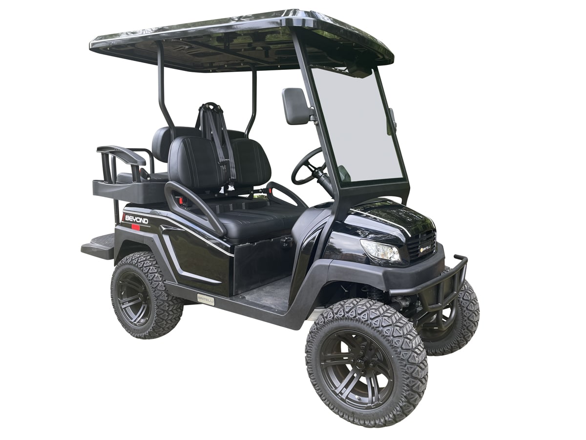 This Bintelli Beyond 4 passenger lifted street legal golf cart is FULLY loaded! Complete with an aluminum frame, aluminum roof supports, AC motor, LED lighting, 14″ wheels, a Bluetooth sound system, reverse camera, hydraulic disc brakes, two-tone premium seats, on-board smart charger, dual USB plugs, extended roof, rear flip seat, head lights, tail lights, turn signals, DOT windshield with wiper, DOT tires, DOT 3-point seat belts, and a 17 digit vin number.