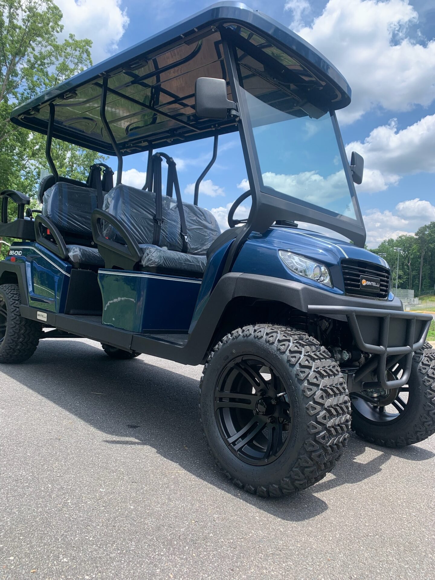 This Bintelli Beyond 6 passenger lifted street legal golf cart is FULLY loaded! Complete with an aluminum frame, aluminum roof supports, AC motor, LED lighting, 14″ wheels, a Bluetooth sound system, reverse camera, hydraulic disc brakes, two-tone premium seats, on-board smart charger, dual USB plugs, extended roof, rear flip seat, head lights, tail lights, turn signals, DOT windshield with wiper, DOT tires, DOT 3-point seat belts, and a 17 digit vin number.