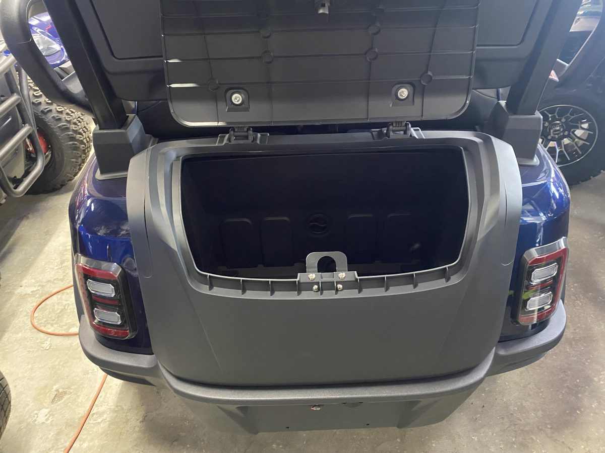 Luxurious Carbon Fiber Style Dash, Locking Glove Compartments, 10.1” Digital Display Screen, Backup Camera, DOT Windshield, USB Ports & Pre-Wired 12v Switches, Horn, Digital Gauges, Lit License Plate Bracket, Built-in ECOXGear Marine Grade Sound System with 7.5A 360W Amp & Four 6.5” Speakers, Removable & Lockable Trunk in Rear, Latched and Lit Frunk, Storage Tray Beneath Rear Seats, Wireless Cell Phone Charging Pad, Tilt Steering, Horn in Steering Wheel, Umbrella Holder
